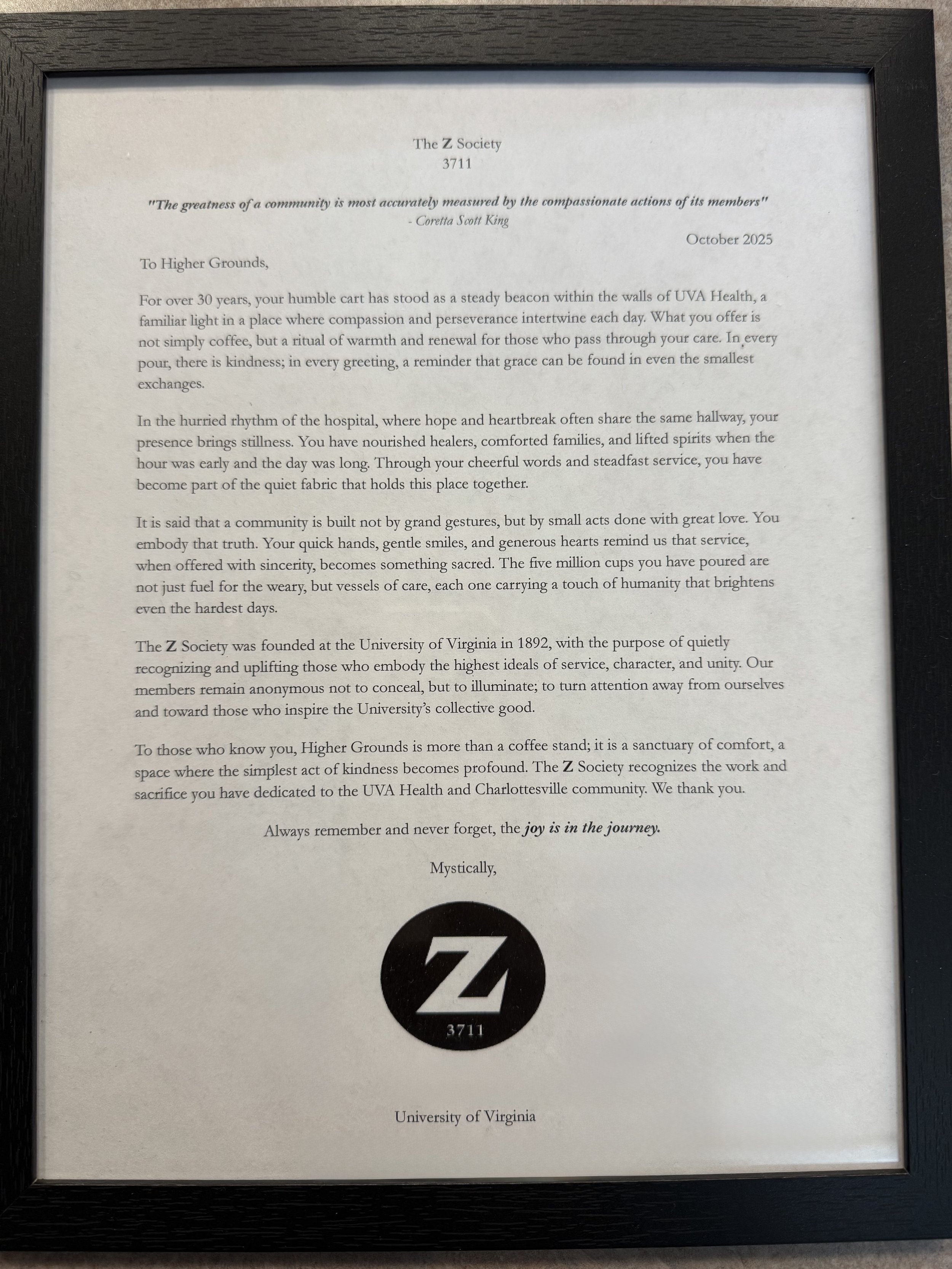 On October 28th, Higher Grouds received the following acknowledgment from the Z Society at each of our UVA Medical Center locations: